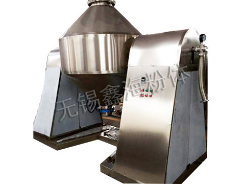雙錐回轉真空干燥機為雙錐形的回轉罐體,罐內在真空狀態下,向夾套內通入蒸汽或熱水進行加熱,熱量通過罐體內壁與濕物料接觸。濕物料吸熱后蒸發的水汽。通過真空泵經真空排氣管被抽走。由于罐體內處于真空狀態,且罐體的回轉使物料不斷的上下,內外翻動,故加快了物料的干燥速度,提高干燥效率,達到均勻干燥的目的。